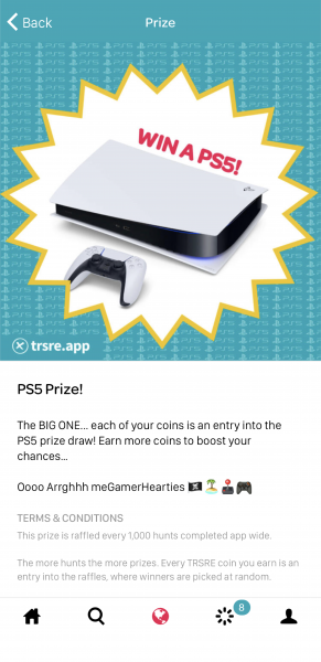 Every hunt you complete wins TRSRE coins to rank up your Leaderboard score. With each coin you win, an entry into the prize raffle...